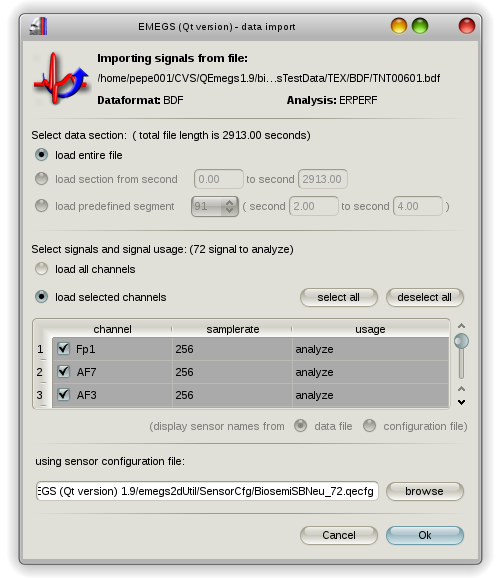 If no appropriate sensor configuration can be found, EMEGS will display a warning message and leave the sensor configuration field blank. Although you can manually select a configuration file using the “browse”-button, you should make sure, that a configuration file is found automatically, as it will save you a lot of tedious click-work. Moreover, if a sensor configuraiton file is found, EMEGS can automatically select EEG sensors and discard all other channels. The first column of a sensor configuration file defines the channel type, and all EEG channels should have the “EEG”-keyword in the first column.