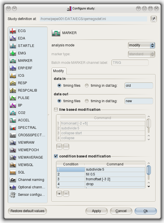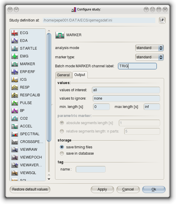 The marker analysis is concerned with timing information needed for the analysis of other channels, exporting values or event-related averaging. It reads timing information from a raw data file, either as a dedicated data channel, an associated file or as information from the data file header, and produces easily readable und modifyable time tables, stored as text-files. It can also be run without dedicated marker/trigger information, subdividing the length of the entire file in a certain number of segments, or fill up the file duration with segments of a fixed size. The latter is called “parametric” marker type, the former “standard” marker type.