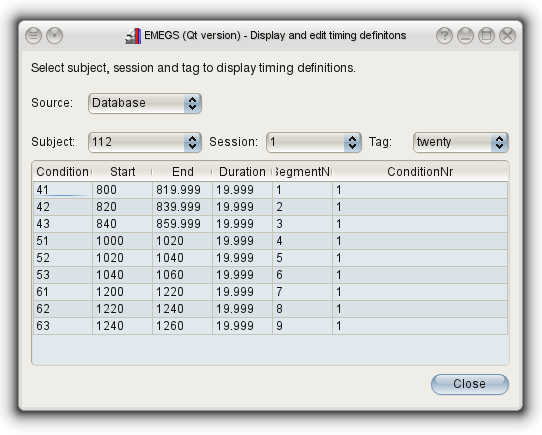 Timing files in EMEGS are needed for certain analysis types that require timing information (such as STARTLE, SPECTRAL, CROSSSPECTRAL, ICG), for exporting values and for timed data read-in. Other then by using the MARKER analysis, they can also be created in a text editor or a table calculation software like OpenOffice.Calc or Microsoft Excel.