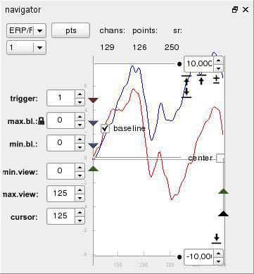 Timing, baseline and amplitude settings are configured using the “navigator” docking window. Triggerpoint, maximum baseline point, minimum baseline point, minimum view point, maximum view point and cursor point can all be set either by changing values in the corresponding spin boxes or by dragging the triangle markers left and right on the navigator window.