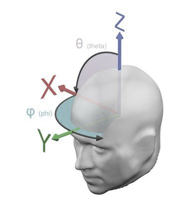 The last three columns contain the sensor positions, specified as spherical coordinates consisting of the two angles theta and phi and a radius rho, with theta and phi measured from the upward (z) axes as shown in the graph below. Although EMEGS (Qt versions) displays data on a realistically shaped head model, sensor approximation, inverse modeling and similar calculations are performed using a spherical head model with the constant default radius of 9 cm for all sensors. Top]