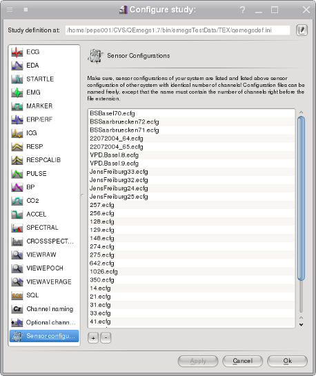 EEG configurations and standard MEG configurations are found by checking a list of possible configuration files for the first occurence of the channel number in question. This list is stored in the study definition of a study folder and can be modified using the configure study dialog: