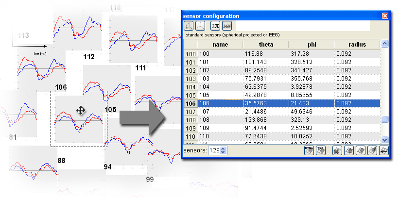 When sensor axes are arranged as planar projection and the arrow selection type is selected, sensor axes can be selected and then dragged to an arbitrary position. 2d-XY-Coordinates are retransformed to sperical coordinates which are updated accordingly on the sensor configuration docking window. Save the thus modified sensor configuration to save changes of the sensor positions for later use. Push the set sensor set button on the sensor configuration docking window to apply the sensor configuration for 3d display. [Top]