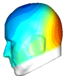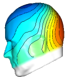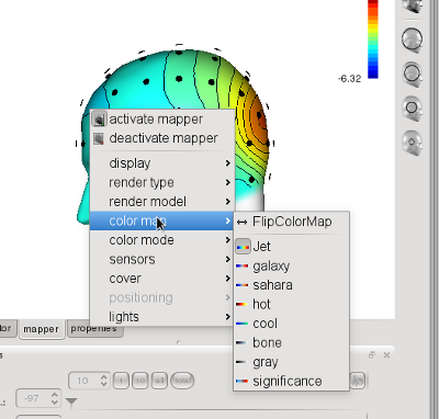 There are different 5 render modes available (areas with contour, smooth transitions, areas without contour, coloured wireframe, wireframe) and a set of colormaps applicable for each mode (jet, galaxy, hot, winter, sahara, gray, bone and significance). Finally there are 5 modes for the mapping of signal values to colors (N colors, Color by amplitude, P value mapping, T value mapping, and F value mapping), the last three of which are optimized for the display of statistical results and are activated and described with the 3d stats page in the statistical coloring section.