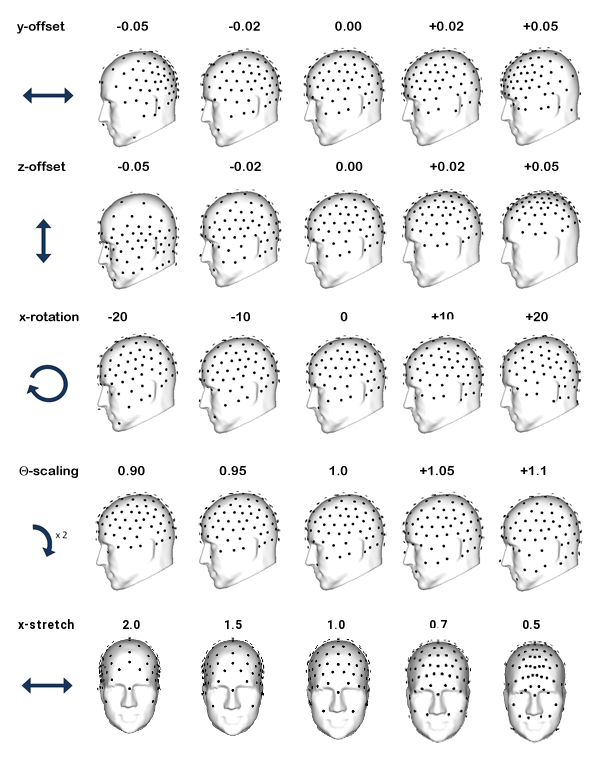 Positioning sensors correctly relative to the render model allows you to adjust the mapping of the signal on the surface. There are five types of adjustments: an “y-offset” which acts in along the anterior-posterior dimension, a “z-offset” which operates along the “inferior-superior” dimension, an “x-rotation” along the left-right dimension, a “theta-scaling” which is similar to the z-offset but keeps theta angle proportions constant and the x-stretch, which can compensate for the flat sides of the realistic head model as compared to the sphere mode which is used for spherical spline interpolation . These transformation are configured on the “positioning” page in the VIEWAVERAGE section of the configure-study dialog. Similar controls are available in the mapper context menu.