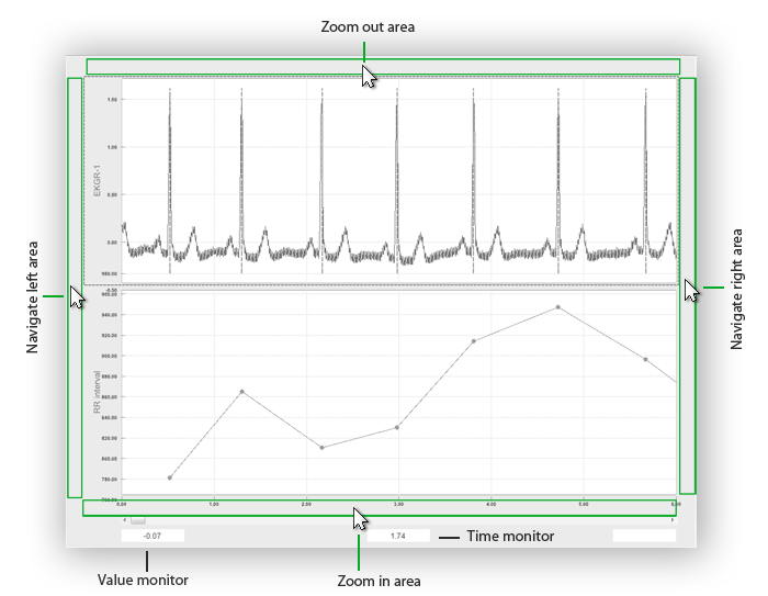 Raw data of only a few signals is displayed in seperately selectable axes, as shown for ECG and its associated IBI trace below. You can navigate the available data either by using the scrollbar on the bottom part of the window and zoom in using the mouse wheel. Or you can click right, left, above and below the axes area to navigate right, navigate left, zoom out and zoom in respectively. The white boxes below the time scrollbar indicate value and time points at the mouse position of the currently selected signal.